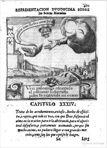 Las SIETE MORADAS enseñadas por Santa Teresa de Jesús como camino espiritual de una progresiva unión con Dios por medio de la oración y la caridad: En cada una de las moradas, la paloma se acerca más al sol, hasta alcanzar la unión. A las puertas de las moradas 1 y 2 hay bestias que acechan (las pasiones, y preocupaciones de la vida). En todas hay palomas que quedan fuera (las almas que no entran).